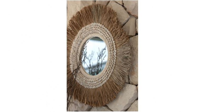 Runder Naturspiegel verziert mit Muscheln.