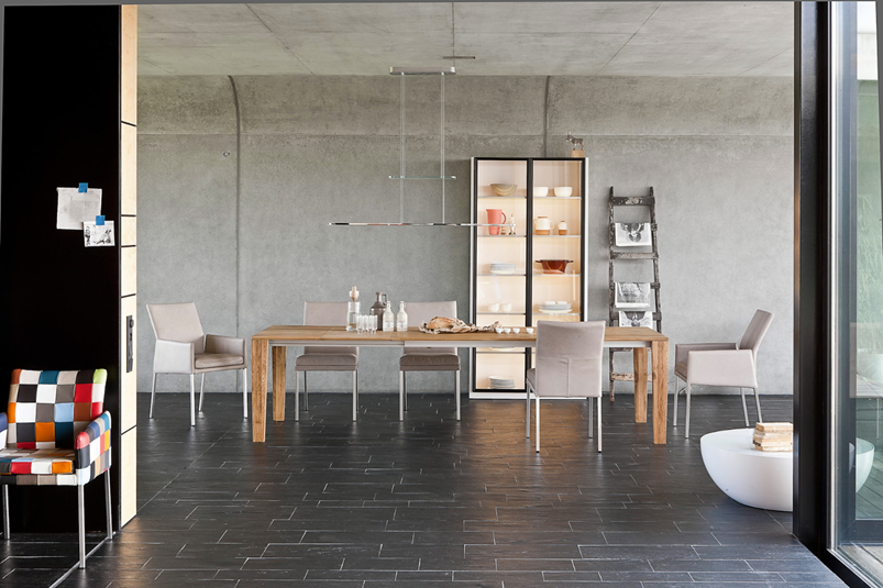 Wählen Sie aus Kernbuche, Eiche oder Nussbaum, jeweils mit hochwertigen Veredelungen. Das Holzgestell gibt es mit quadratischen oder konischen Beinen, die Tischplatte (20 mm stark) begeistert mit feiner Maserung in Längsrichtung und abgestuften Kanten.